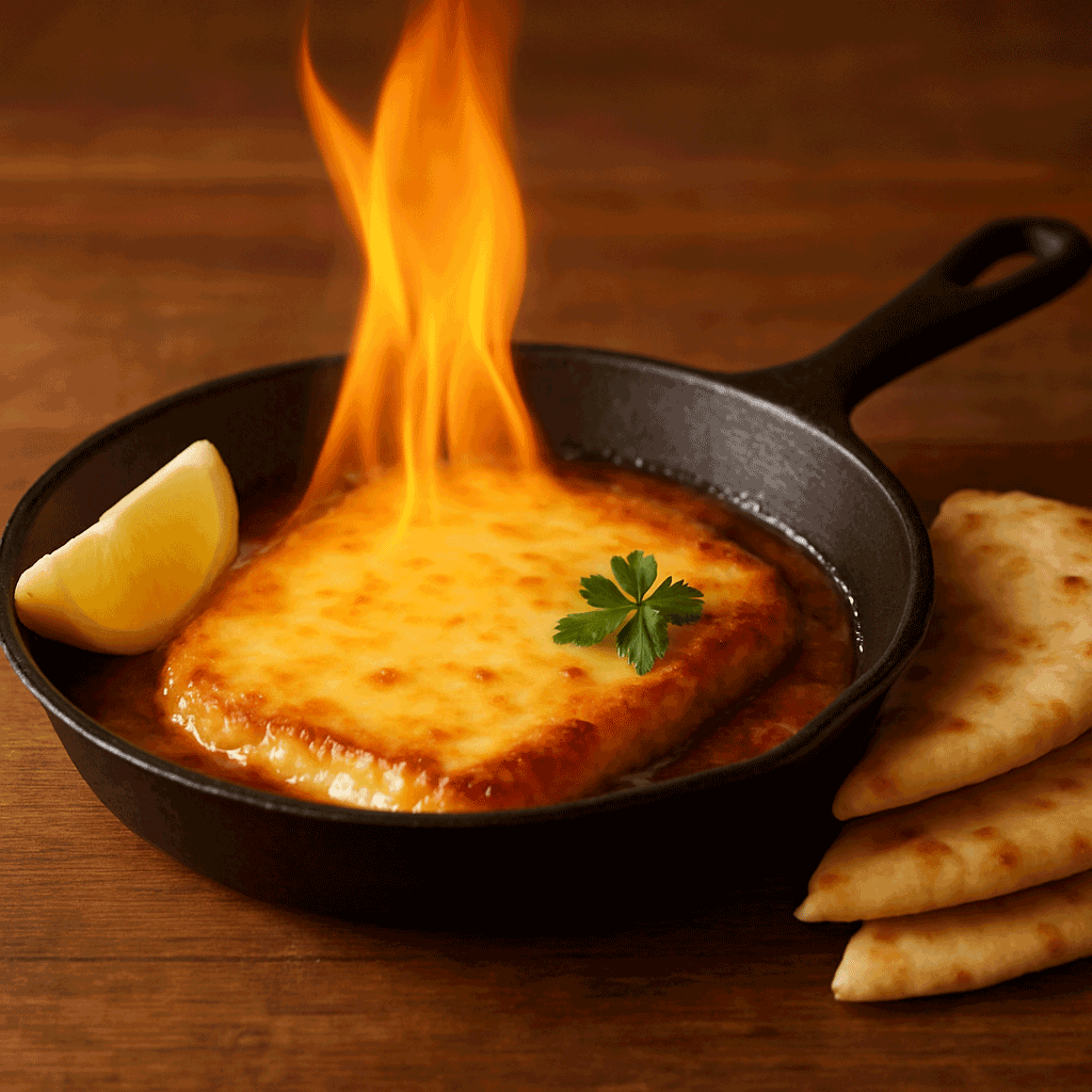 The cheese is pan-seared until golden and bubbling, then finished tableside with a splash of brandy and ignited in a brief flambé, creating a warm flame and the classic celebratory shout of “Opa!”. The fire quickly burns off, leaving behind a rich, savory cheese with a crisp exterior and soft center, often finished with a squeeze of fresh lemon.