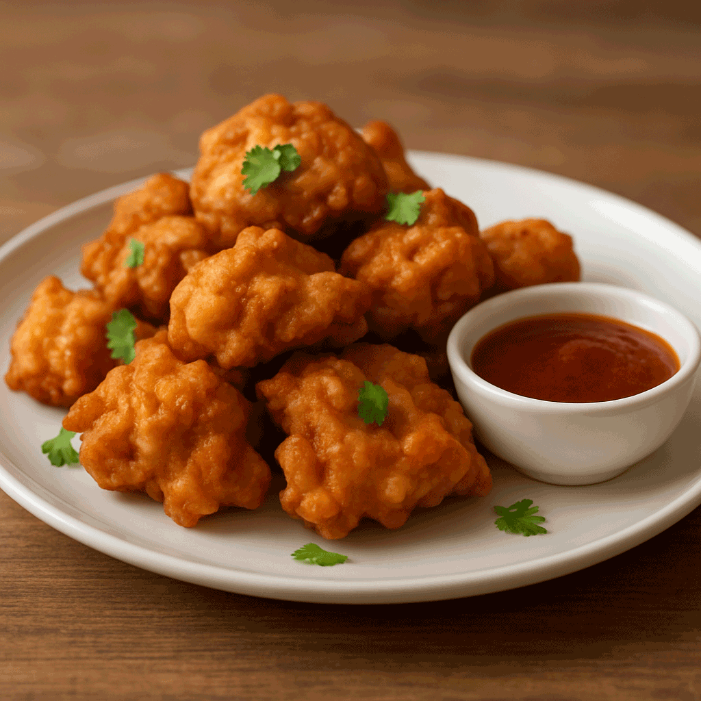 Chicken pakora is a popular Indian appetizer made with tender pieces of chicken marinated in spices, coated in a seasoned chickpea-flour batter, and fried until crispy and golden. It’s flavorful, comforting, and perfect for sharing. Made with boneless chicken pieces, marinated with ginger, garlic, chili, and warm spices, coated in a besan batter (gluten free chickpea flour) for a light coating which is crispy on the outside and juicy on the inside. The spices soak into the chicken before frying, giving each bite deep flavor rather than just surface heat.