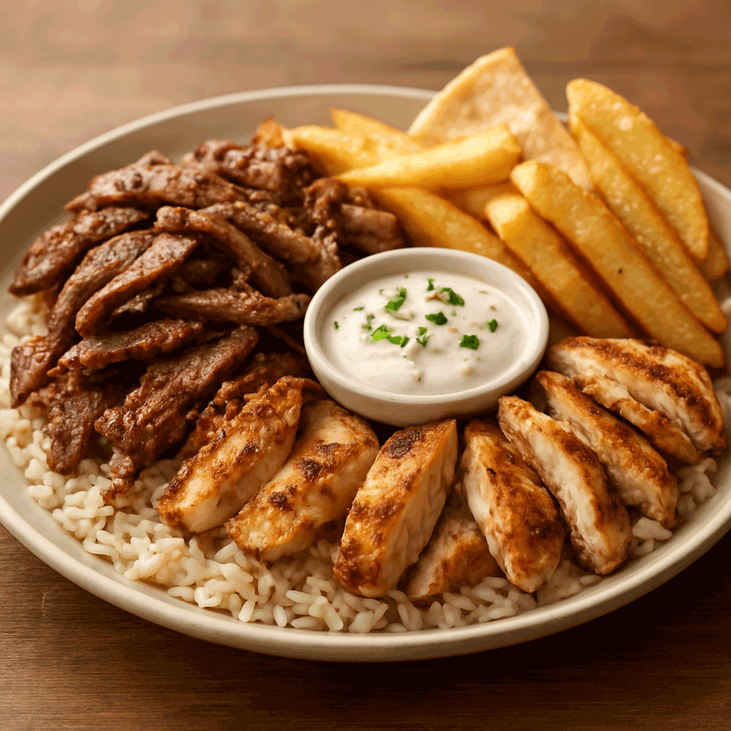Gyro meat and sliced grilled chicken served on rice with pita, tzatziki, onion, and tomato. Hearty, filling, and full of flavor.