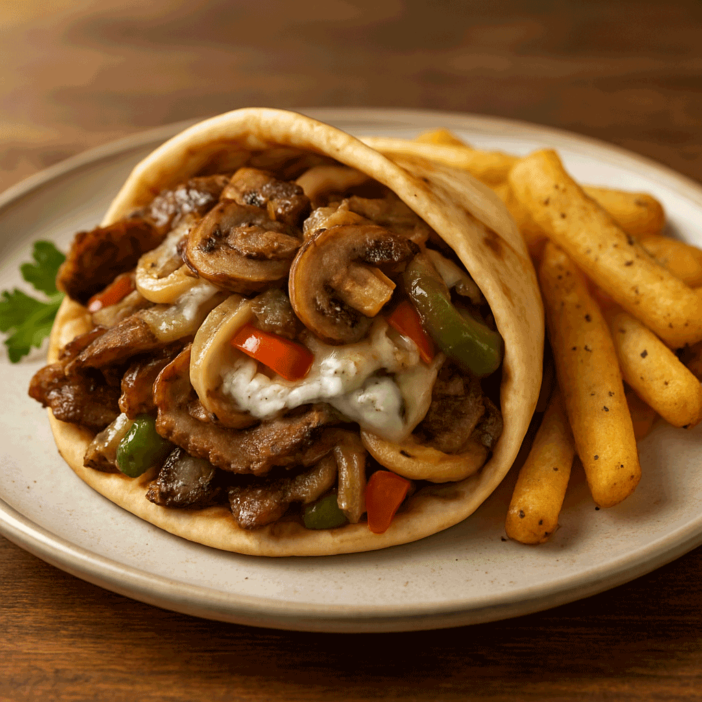 A bold fusion that brings together two classics. Thin slices of seasoned gyro meat are wrapped in warm pita and topped with sautéed mushrooms, onions, and bell peppers, then finished with melted provolone cheese. Balanced with cool, creamy tzatziki sauce, this wrap combines the savory richness of a Philly cheesesteak with the traditional flavors of a Greek gyro for a hearty, crave-worthy bite.