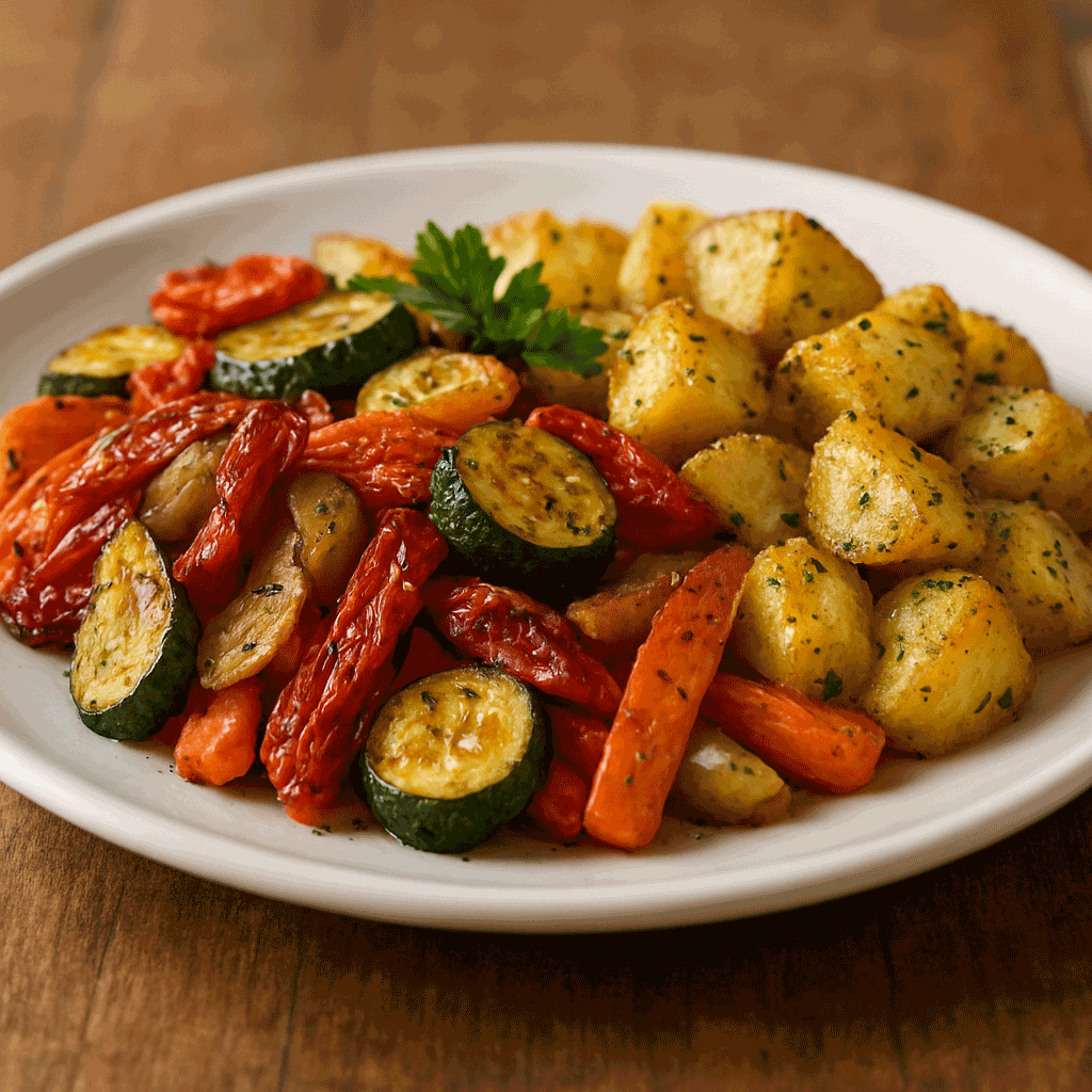 A colorful medley of zucchini, red peppers, carrots, and onions, tossed with Greek seasoning and savory sun-dried tomatoes, then roasted until tender and lightly caramelized. Served alongside roasted herb potatoes, this dish highlights bright Mediterranean flavors, simple ingredients, and comforting, oven-roasted goodness in every bite.
