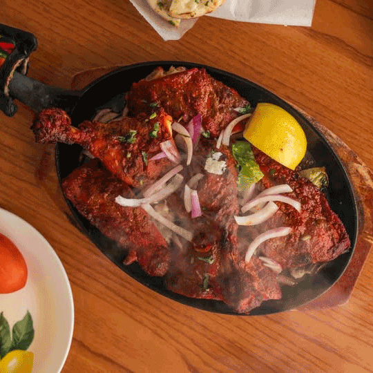 Bone-in chicken leg quarters marinated in yogurt and spices, baked in a clay oven. Juicy, savory, and satisfying.