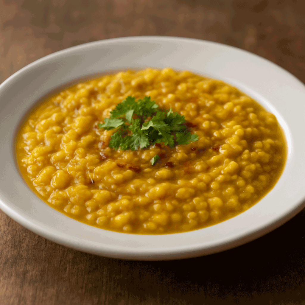 Yellow lentils are slow-cooked until soft and creamy, then finished with a fragrant tadka of sizzling garlic, onions, cumin seeds, and warming spices. This final step transforms the dish, layering rich aroma and depth onto the mild, earthy lentils.