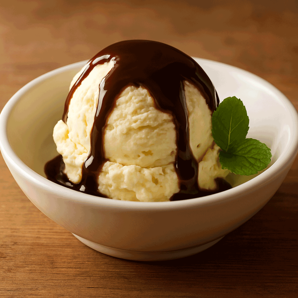 A generous scoop of traditional vanilla ice cream, sweet and indulgent. Sweet, cold, and satisfying. Always a favorite.