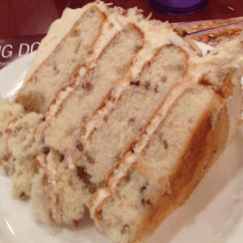 Three layers of white cake baked with coconut and pecans, filled and wrapped with cream cheese mousse and finished with crushed butter pecan cookies, toasted coconut, and chocolate straws.